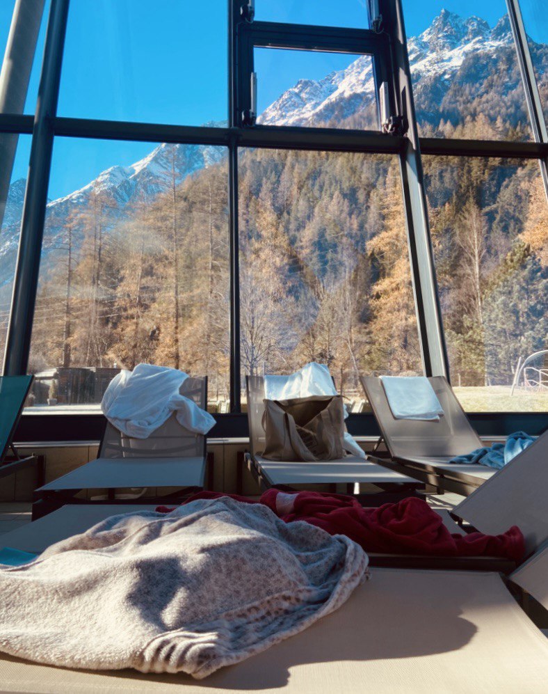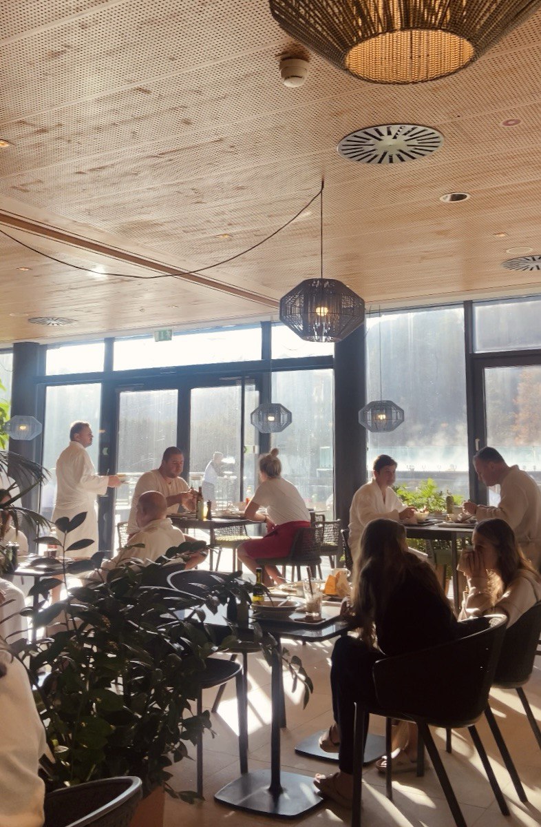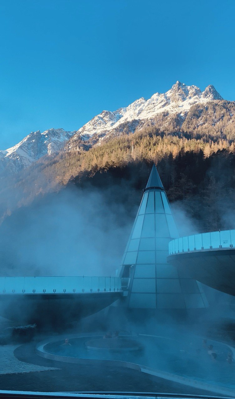 Мы начали с центральных термальных бассейнов. Вода, при температуре 36°C, ощущалась идеально, особенно в контрасте с бодрящим горным воздухом. Плавный переход между крытым и открытым бассейнами добавлял очарования, а из открытой части открывался захватывающий вид на заснеженные Альпы.