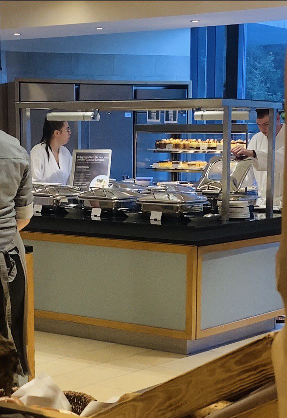 После купания в бассейнах мы побаловали себя едой в ресторане. Меню предлагало как блюда à la carte — пиццу, бургеры, стейки и пасту, так и блюда в стиле шведского стола с салатами, закусками и десертами. На двоих, включая напитки, общая сумма составила €44 — справедливая цена за качество и количество еды. Пиво стоило €5 за бокал, что стало приятным дополнением к впечатлениям.